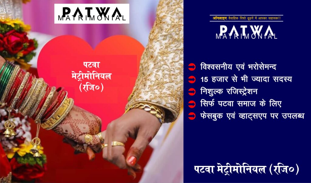 बुलंद हौसले, बेमिसाल परिणाम !कामयाबी की नई परिभाषा: पटवा मेट्रिमोनियल प्रगति पथ पर पटवा मैट्रिमोनियल प्रिय पटवा परिवार के सम्मानित साथियोआप सभी को महत्वपूर्ण जानकारी देने में हर्ष हो रहा है कि #पटवा_मेट्रिमोनियल शादी ग्रुप द्वारा एक और शादी दिनांक 09 दिसंबर 2024 को वाराणसी में हो गई है। पटवा मेट्रिमोनियल (पंजी0) की ओर से